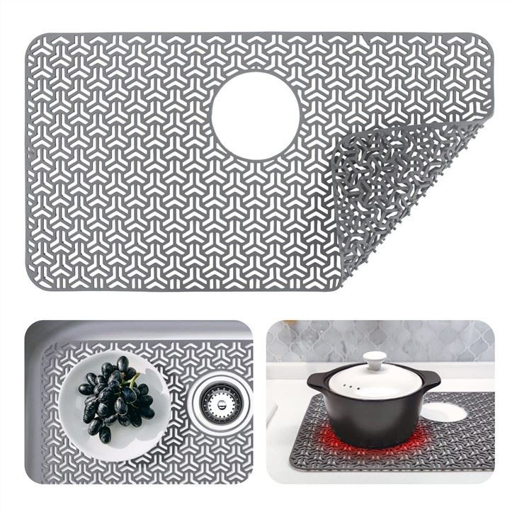 Silikonová podložka pod dřez je poddajná a antikorozní. Dokáže účinně zabránit rozbití křehkého nádobí, pokud náhodou spadne do dřezu, a zabrání poškrábání nerezových a keramických dřezů. Silikonové chrániče dřezů pro kuchyňské dřezy jsou odolné a nezkorodují a neznečišťují dřez.